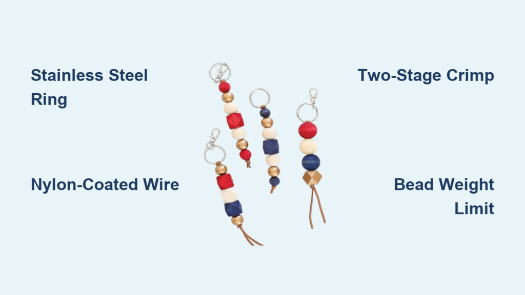 Skip cheap plastic beads or undersized key rings—they guarantee early failure. Your foundation demands a 25 mm stainless steel split ring (not brass, which corrodes) and 0.38 mm nylon-coated beading wire. This specific thickness handles tension without snapping, while the nylon coating prevents metal-on-metal friction. Crucially, invest in 2 mm silver-plated crimp beads—they create seamless connections regular pliers can’t achieve.