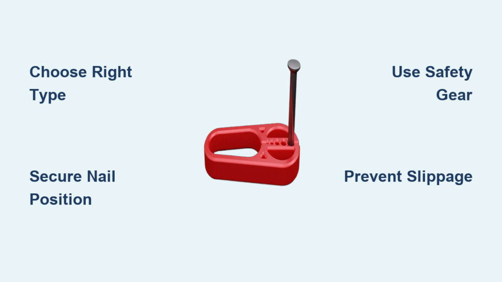 Always wear safety glasses to guard against flying nail fragments. Use leather gloves for secure grip on both holder and hammer, especially in cold or wet conditions. Steel-toed boots protect your feet from dropped fasteners during construction projects. Non-negotiable: Never skip eye protection—even a small nail fragment can cause permanent eye damage.
