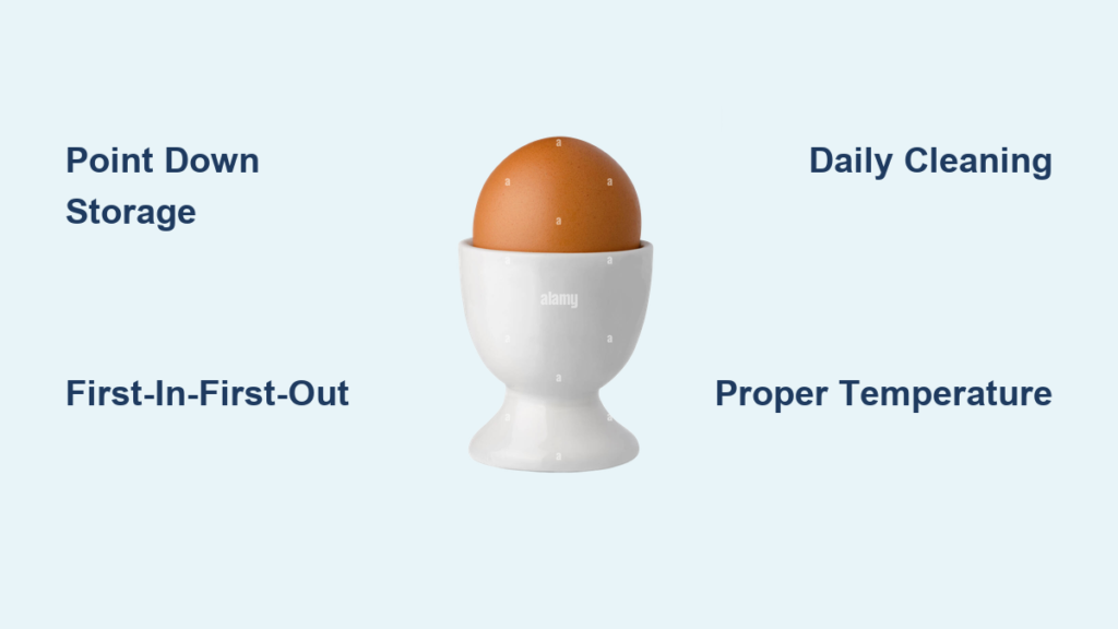 Store eggs pointed end down. This centers the yolk and prevents the air cell (located in the large end) from breaking internal membranes. The positioning keeps the yolk away from the air pocket, dramatically slowing aging.