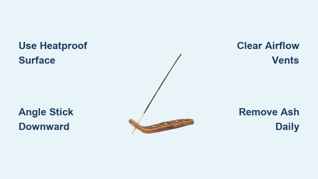 Mastering how to use an incense holder turns chaotic smoke into intentional calm. Start with a heavy ceramic stick holder on a stone tile—this combo prevents 90% of common issues. Remember the 12-inch clearance rule from flammables, and always have sand nearby for emergencies. Within one week of applying these steps, you’ll notice cleaner burns, longer-lasting incense, and zero ash cleanup. For your next session, try lighting near an open window (but not in the draft) to watch smoke flow like liquid—this simple adjustment creates the smoothest scent distribution. Your sanctuary awaits; burn safely.