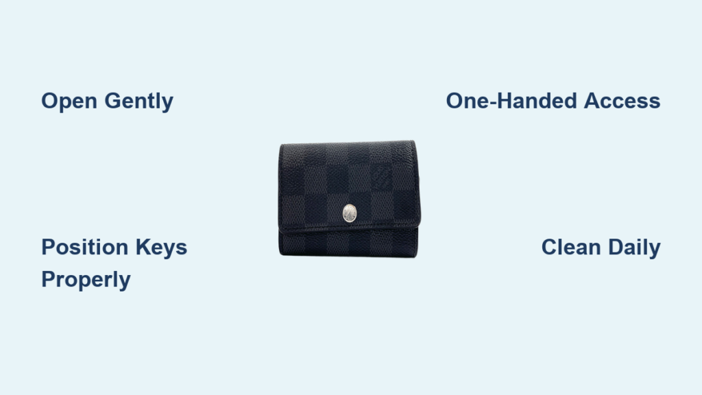 Carry two holders: Monogram for daily essentials (4 keys max), Damier Azur for work access (keys + badge). Clip both to your bag’s interior D-rings—one behind the other. This prevents overloading while maintaining instant access.